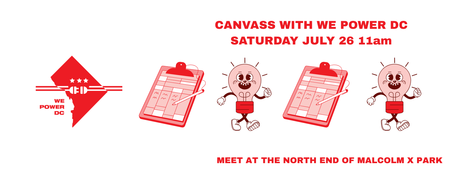 Join us on Saturday, July 26th at 11am to talk to neighbors in Ward 1 about public power. Training and materials will be provided--wear comfortable shoes for walking and bring friends! We will meet at the north end of Malcolm X Park.