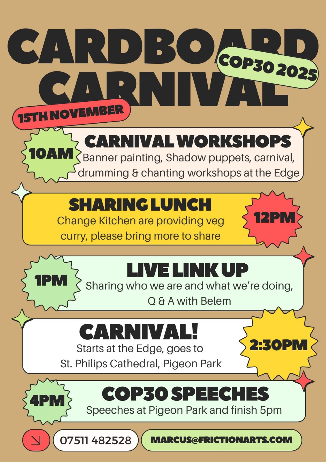 To coincide with the COP30 international climate conference in Belém, Brazil, climate activists and youth groups in Birmingham are holding a ‘Cardboard Carnival’ with arts, crafts, music, dancing, refreshments, and a live link up with youth groups in Europe and South America.