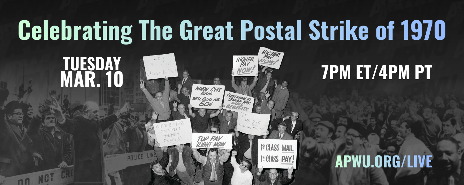 March marks the anniversary of The Great Postal Strike of 1970. To commemorate the historic moment, APWU President Jonathan Smith is hosting a livestream at 7 p.m. ET/4 p.m. PT on Tuesday, March 10. The hour-long livestream will recount that momentous day and the events that led up to the strike. Hear from members who took part in the strike, and the perspective of its impact from today's young members.
