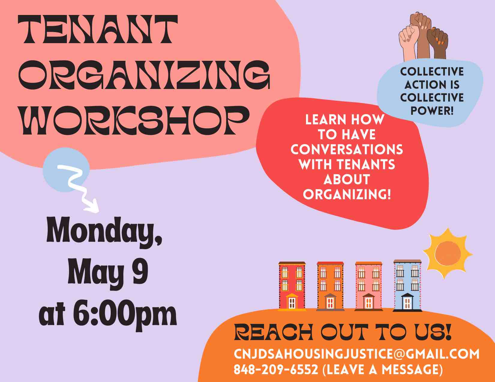 Join Central Jersey DSA's Housing Justice Committee for a Tenant Organizing Workshop. Anyone who is interested in organizing with their neighbors and fellow tenants is welcome, so invite friends, family, co-workers, and community members!