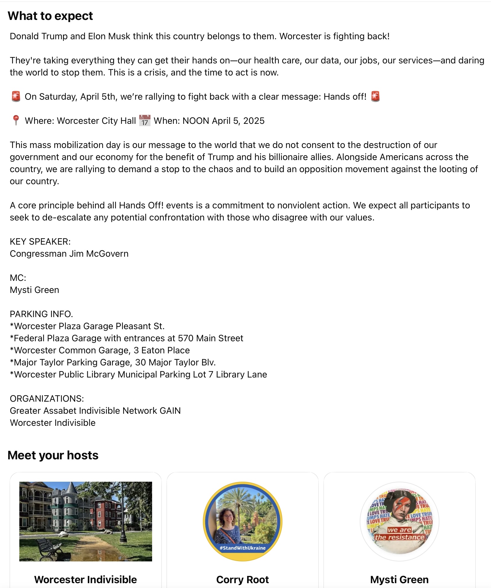Bring your same anti-Elon, anti-DOGE, anti-Tesla signs and energy. Should be a great crowd. Rep. Jim McGovern will speak.
