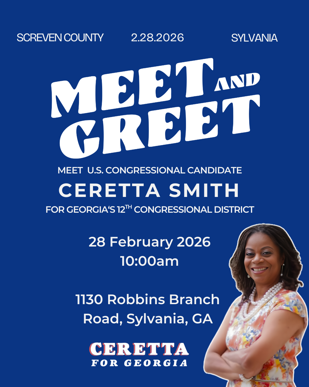 Come meet Ceretta in person, hear her heart for service, and learn more about her vision for Georgia’s 12th Congressional District. As a veteran, woman of faith, and community advocate, Ceretta is committed to putting people over party, fighting for veterans, protecting Social Security and Medicare, supporting families, and strengthening our local communities.