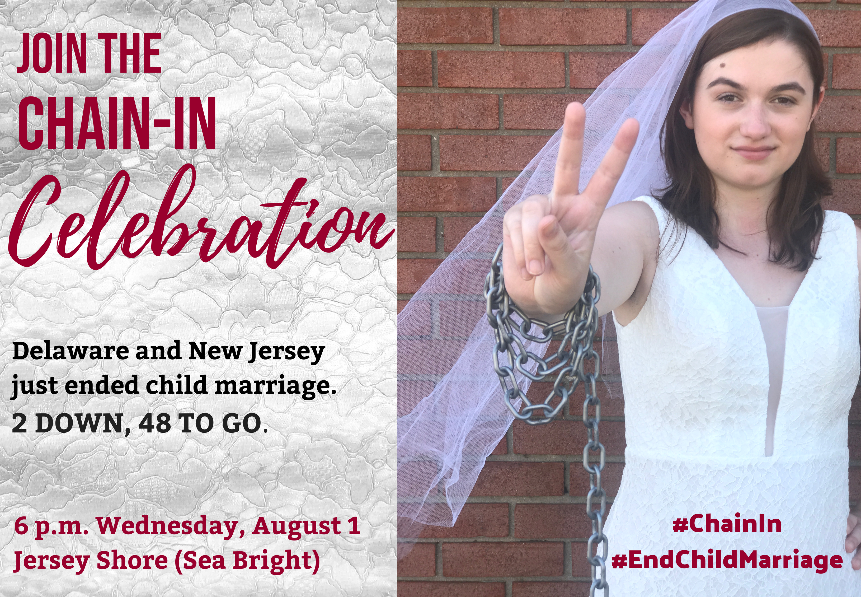 We at Unchained At Last invite you to join us at the Jersey Shore on August 1 for the first ever Chain-In Celebration. We'll wear the bridal gowns and chains we always wear at Chain-Ins (which we provide!), but we'll skip the tape on our mouths so we can smile and cheer on the heroes who made this happen - while we also urge 48 states to follow Delaware and New Jersey's lead.