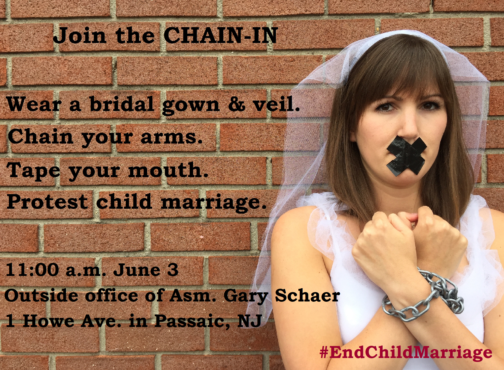 We at Unchained At Last, in partnership with the National Organization for Women of New Jersey and Westfield 20/20, urge you to Chain-In with us outside Asm. Gary Schaer's office on June 3. We'll wear bridal gowns and veils, with our arms chained and mouths taped, to show Schaer and other legislators what life looks like for a girl who is forced to marry.