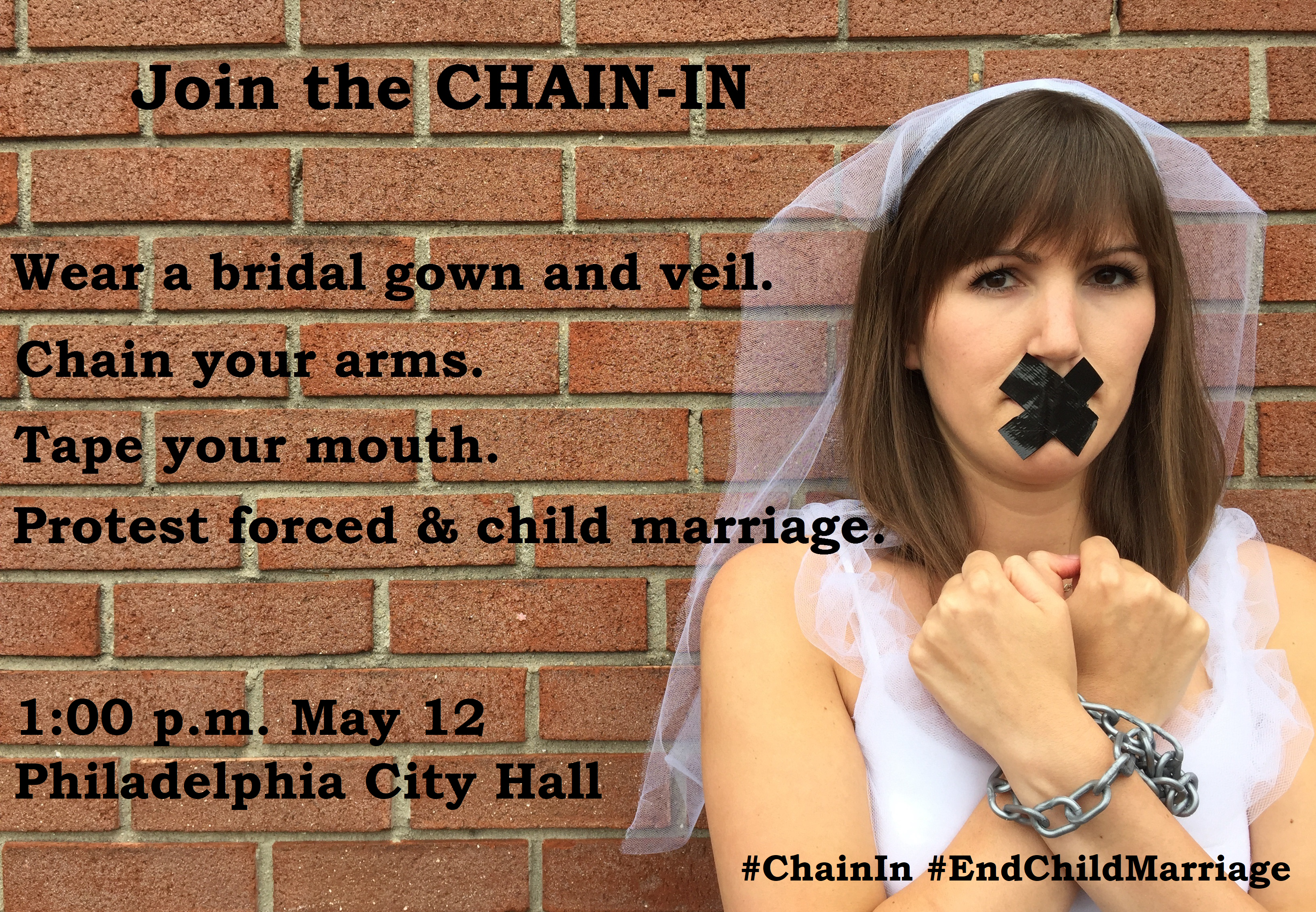 We at Unchained At Last urge you to Chain-In with us in Philadelphia on May 12. We'll gather outside City Hall wearing bridal gowns and veils, with our arms chained and mouths taped, to protest child marriage. We'll urge legislators to pass HB1038, the simple, commonsense bill that would end child marriage in Pennsylvania.