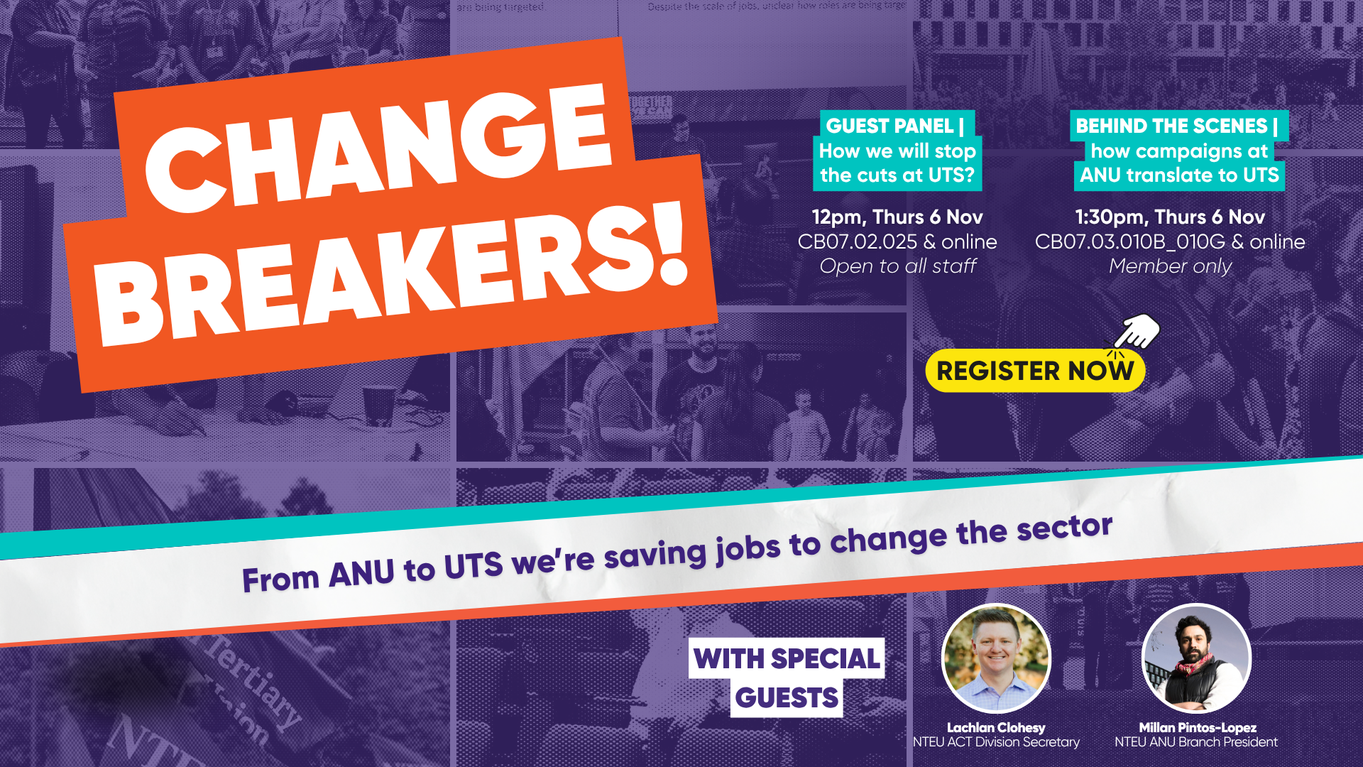 NTEU’s Lachlan Clohesy (ACT Division Secretary), and Millan Pintos-Lopez (ANU Branch President) are coming to UTS to share stories from their successful union campaign which saved dozens of jobs, protected staff’s psycho-social safety and ended the tyranny of a seemingly unaccountable Vice-Chancellor.
