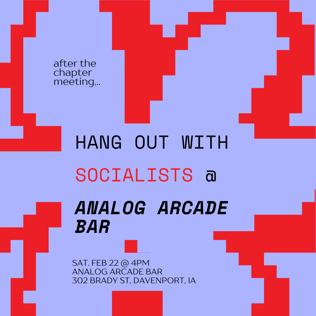 Come to our monthly meeting of the Quad Cities chapter of the Democratic Socialists of America! Here we'll discuss what our chapter is working on and how you can get in the fight for socialism!