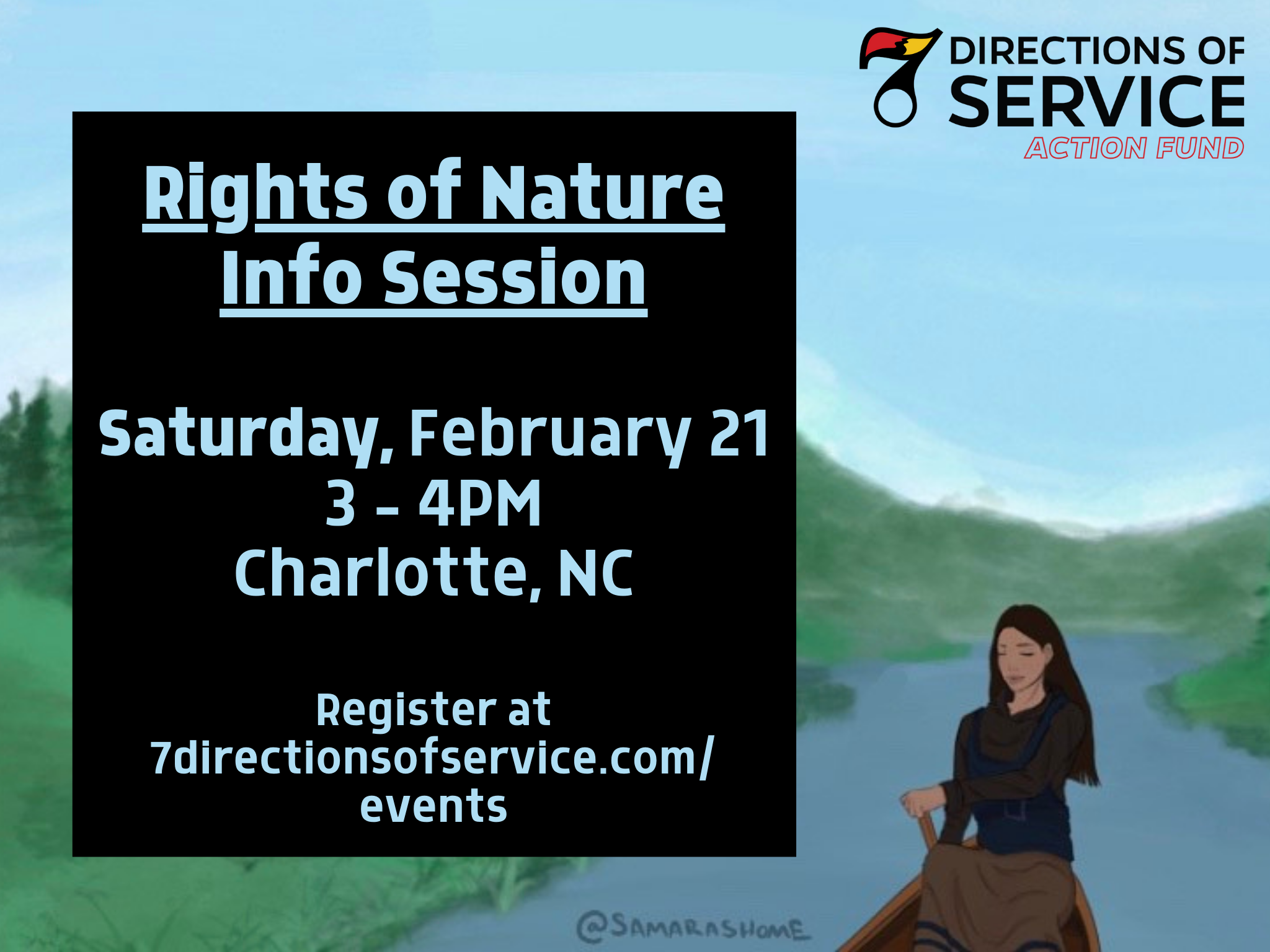 Join 7 Directions of Service Action Fund for a community info session on the Indigenous-led Rights of Nature campaign in NC. Rights of Nature laws and policies seek to grant legally enforceable rights to rivers and ecosystems, and are rooted in Indigenous values of kinship and interconnectedness. During this session we will discuss the broader Rights of Nature movement, what’s next with our campaign and how to plug in. We hope to see you there!