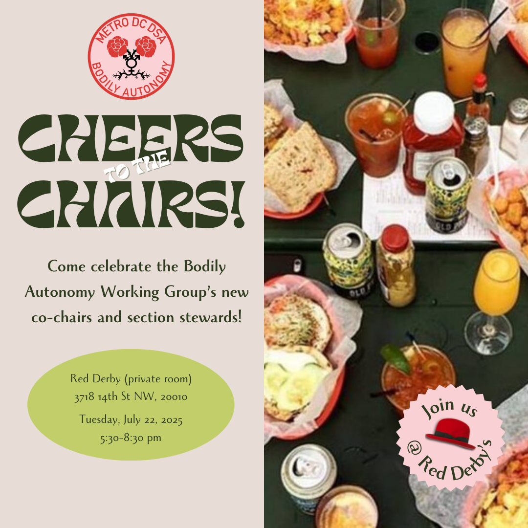 Join the Bodily Autonomy Working Group (BAWG) in our Cheers to the Chairs happy hour at Red Derby’s private room starting at 5:30pm! We will be celebrating our new co-chairs and stewards for BAWG, including the Repro Justice Campaign, Trans & Queer Liberation Campaign, Socialist Feminist Section, and Queer Section.