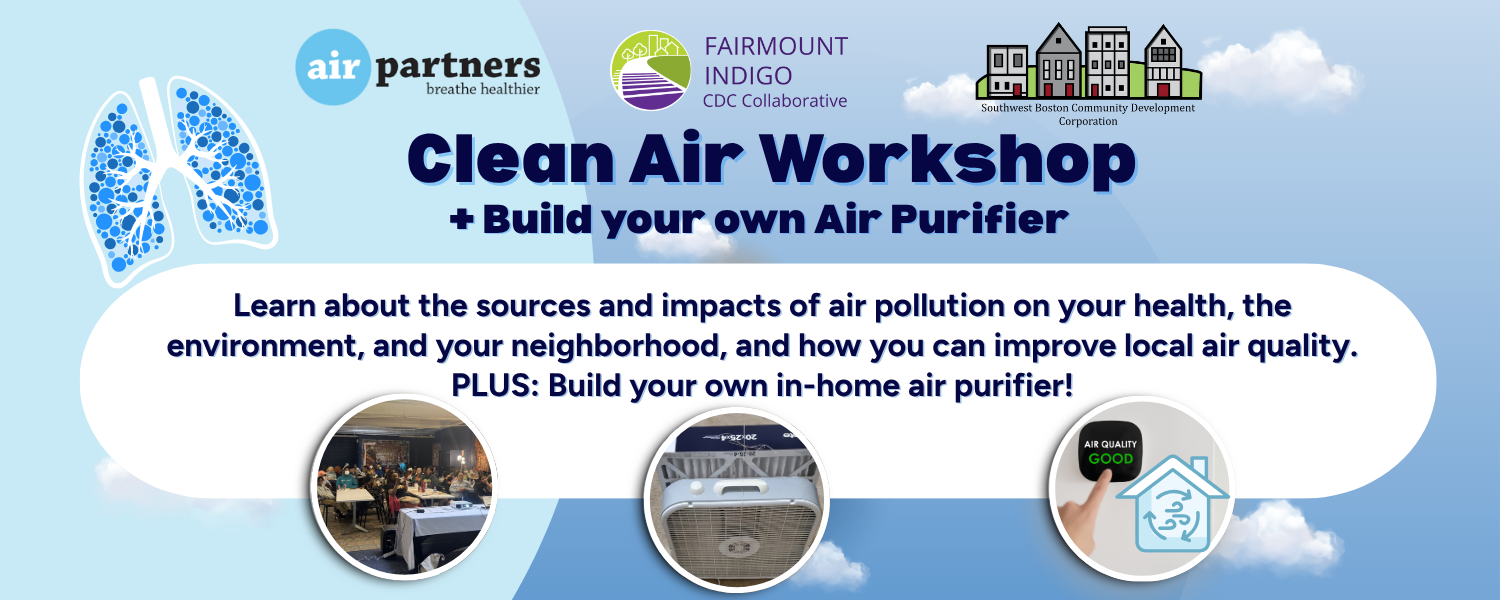 Join the Fairmount Indigo CDC Collaborative, Air Partners, and Southwest Boston CDC for an engaging, hands-on community workshop where we will explore the importance of clean air and its impact on our health and well-being. Together, we’ll learn simple, affordable ways to improve air quality at home, and each attendee will get to build their very own air purifier.