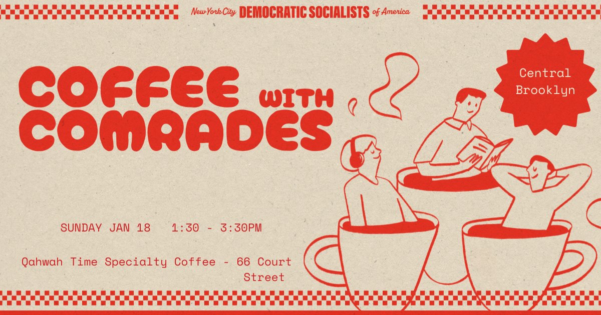 Join new and seasoned NYC-DSA members alike at Coffee with Comrades! This will be a casual, small group gathering where we can get to know each other, discuss the events of the day, and explore how you can get involved in DSA. All are welcome to join, even if you’re not a member of DSA yet! Come and go as you please.