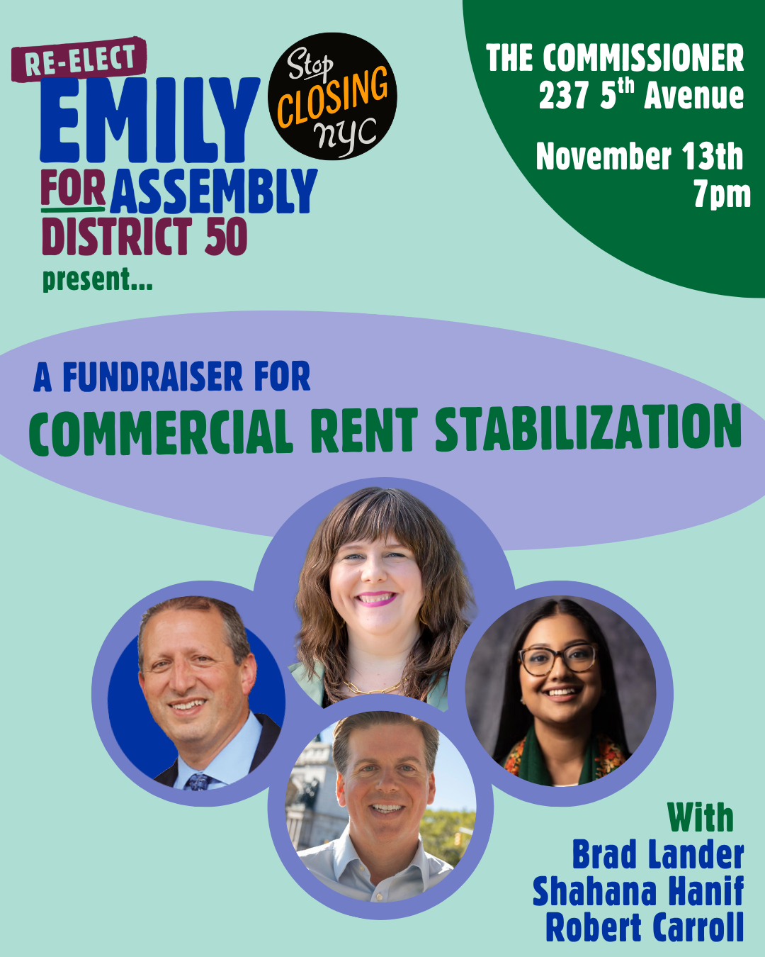 Emily and Senator Julia Salazar have introduced the Commercial Rent Stabilization Act (A5568A/S8319) in the Legislature, and their effort needs your help! Come to The Commissioner on November 13th at 7pm to join Emily, Comptroller Brad Lander, Council Member Shahana Hanif, and Assemblyman Robert Carroll to celebrate our local favorites, learn about the bill and our approach to making it law, and help Emily stay in Albany to see it through!