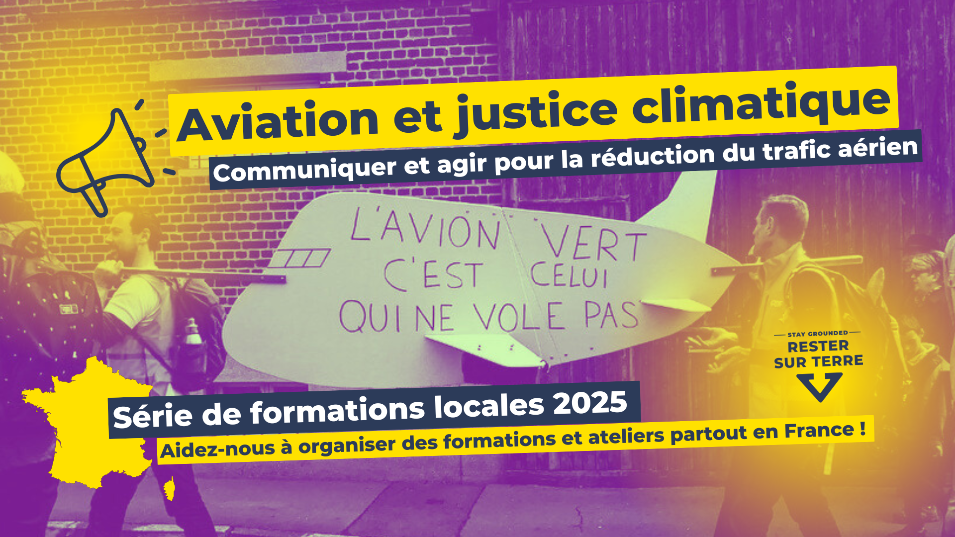 Or, les soi-disant solutions technologiques ne sont ni suffisamment efficaces, fiables et rapides pour représenter à elles seules une panacée : la réduction du trafic aérien doit faire partie de l'équation ! C'est pourquoi pour 2025, le réseau Rester sur Terre vous propose d'organiser un ou plusieurs ateliers ou formations "Aviation et justice climatique" dans votre ville, afin de diffuser les narratifs qui nous permettent de donner à voir pourquoi et comment cette réduction peut advenir !