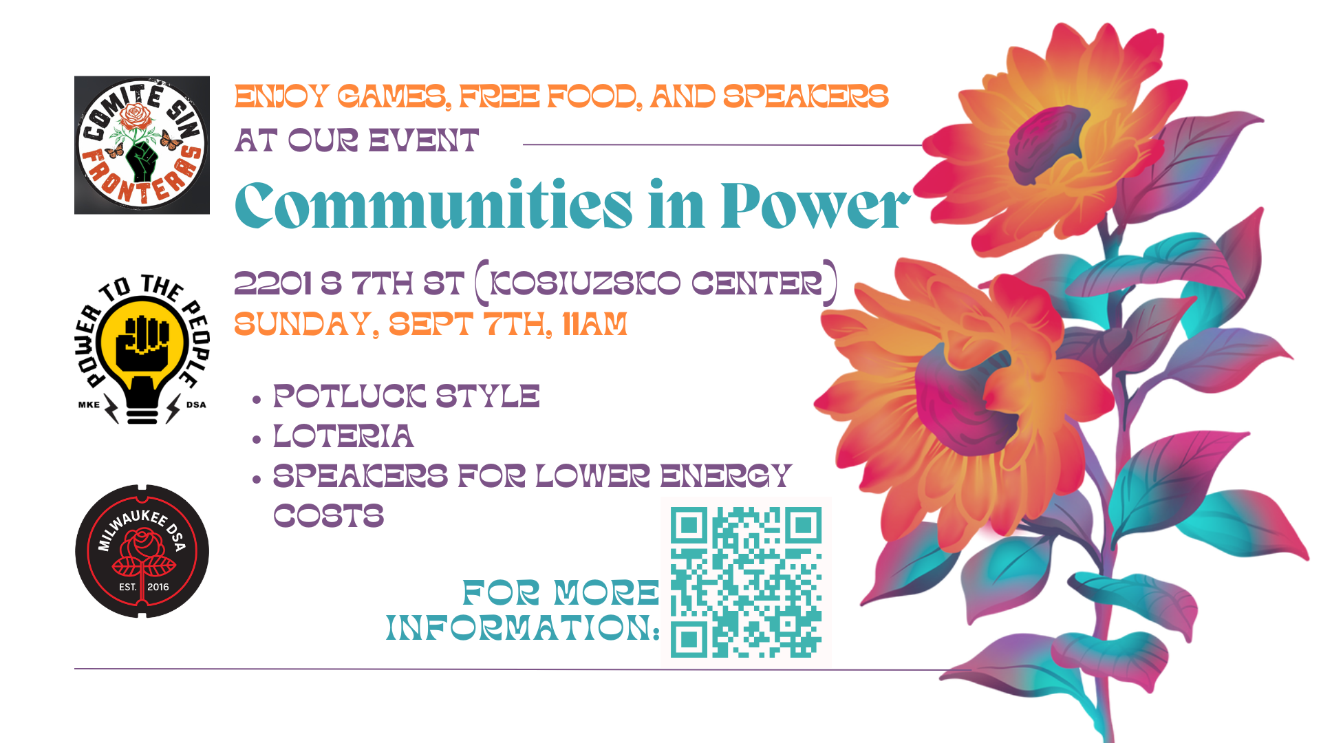 Join us for lunch and loteria in Kosciuszko Park. Speakers, including Alderman Alex Brower, will be discussing with the South Side Milwaukee Community how power can be returned to the people with a public energy utility.