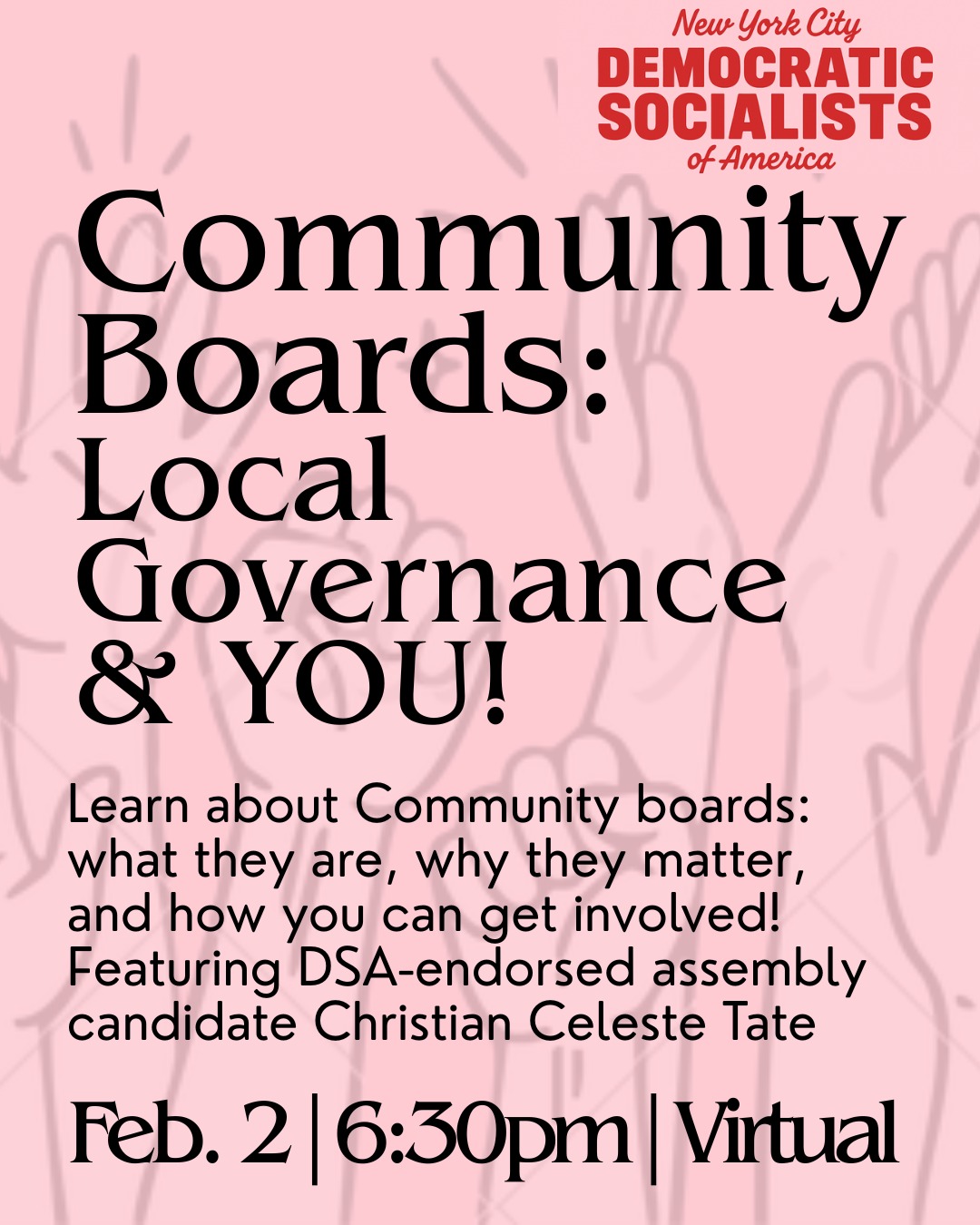 We’ll be joined by active Community Board members, including Assembly candidate Christian Celeste Tate, who serves as Vice President of his Community Board in Brooklyn.