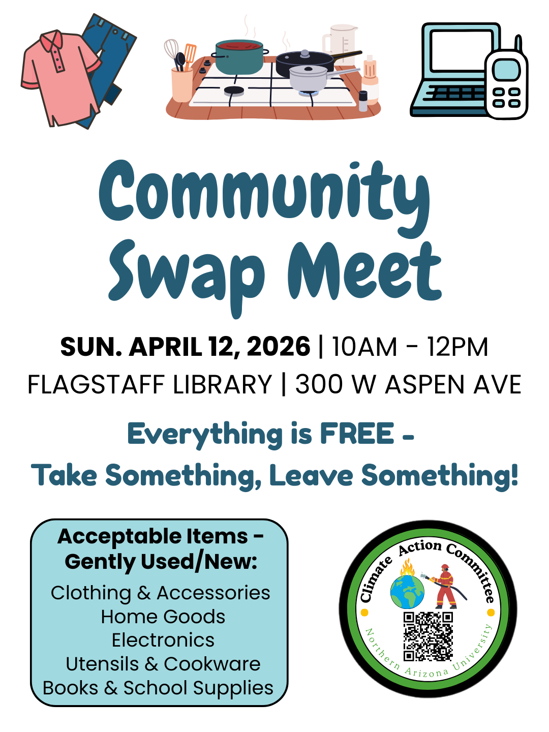 Join NAZCCA & NAU's Climate Action Committee for a community swap meet for April 12th 10am-12pm!