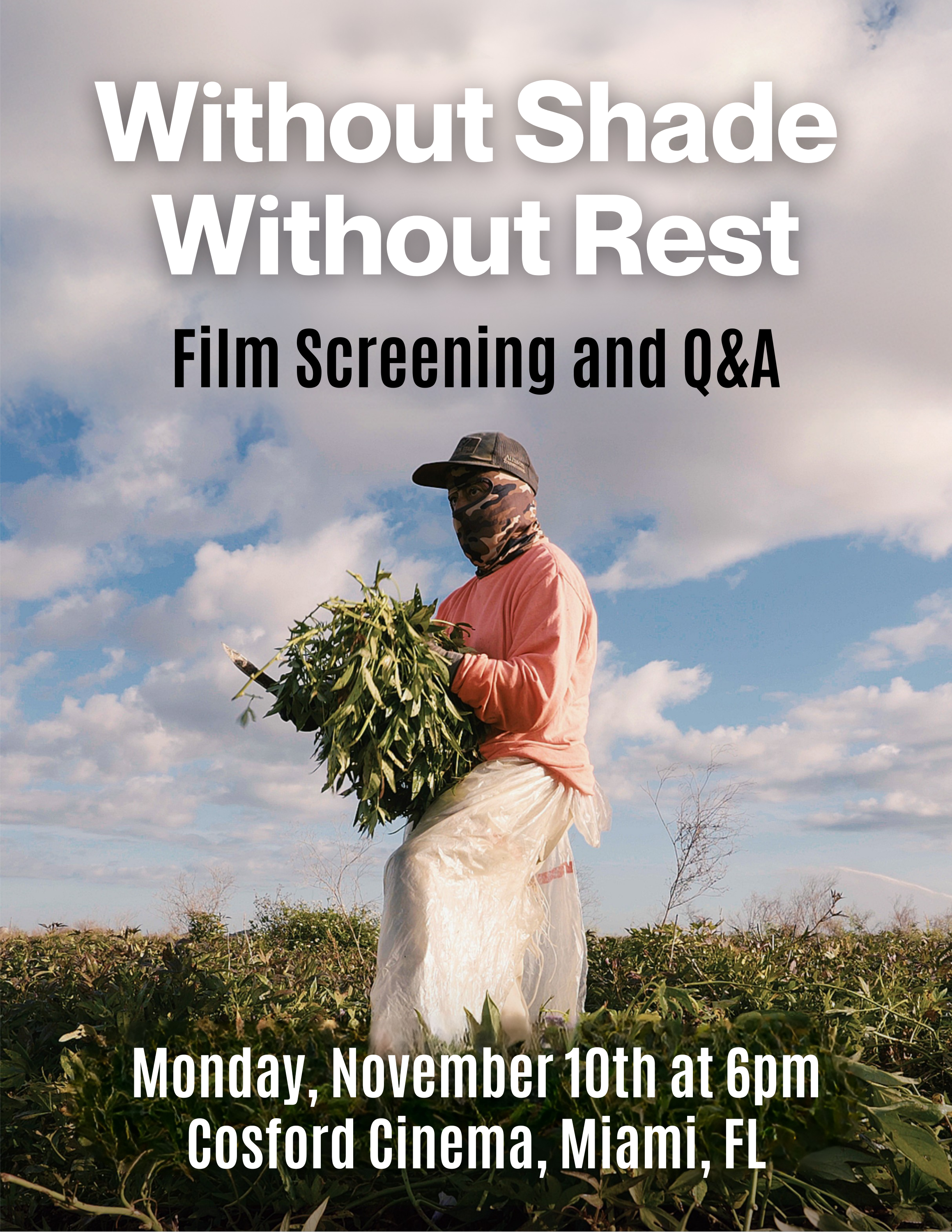 This November 10th, join us at Cosford Cinema in the University of Miami for the Miami premiere of Without Shade, Without Rest, a new short film by Six Eye Films! Without Shade, Without Rest tells the powerful story of two Florida-based organizations, WeCount! and the Coalition of Immokalee Workers, and their efforts to protect outdoor workers from the dangers of extreme heat. After the film, we'll be hosting a brief Q&A with WeCount! worker leaders and filmmakers of Six Eye Films. The event is free and open to the public!