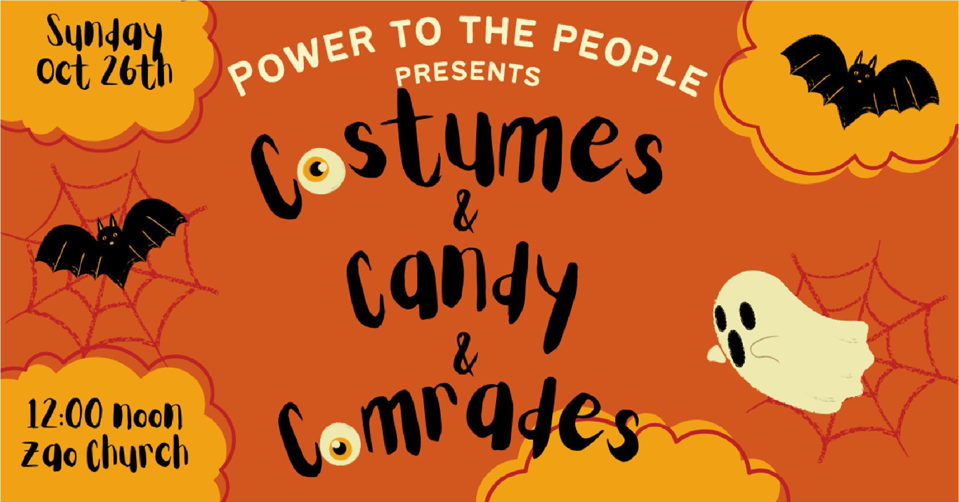 Join us as we welcome in spooky season with a special Power to the People canvassing event! We’ll be doing something a little different and handing out candy with our petitions! Come dressed in your favorite Halloween costume, or pick up one of our impromptu costume supplies!