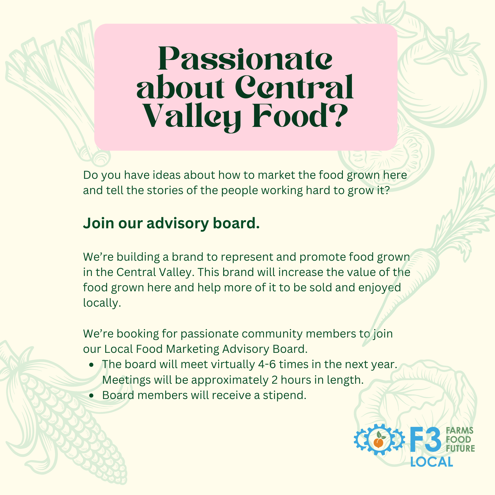 This campaign is being funded as part of the F3 (farms Food Future) Initiative, which is supporting agriculture in California’s Central Valley by developing new ag technology, growing food sustainably using regenerative farming practices, and offering cutting-edge training for quality jobs in the world’s food production capital. CAFF is partnering with F3 Local to create and manage the local food marketing campaign.