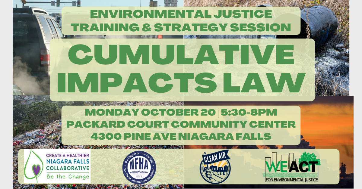 Join WEACT, the Clean Air Coalition of WNY, Create a Healthier Niagara Falls Collaborative, and other community partners working on environmental justice issues for a teach-in to learn about the new Cumulative Impacts Industrial Siting Law, and how this recently passed legislation can be leveraged to rein in polluters in our neighborhoods!