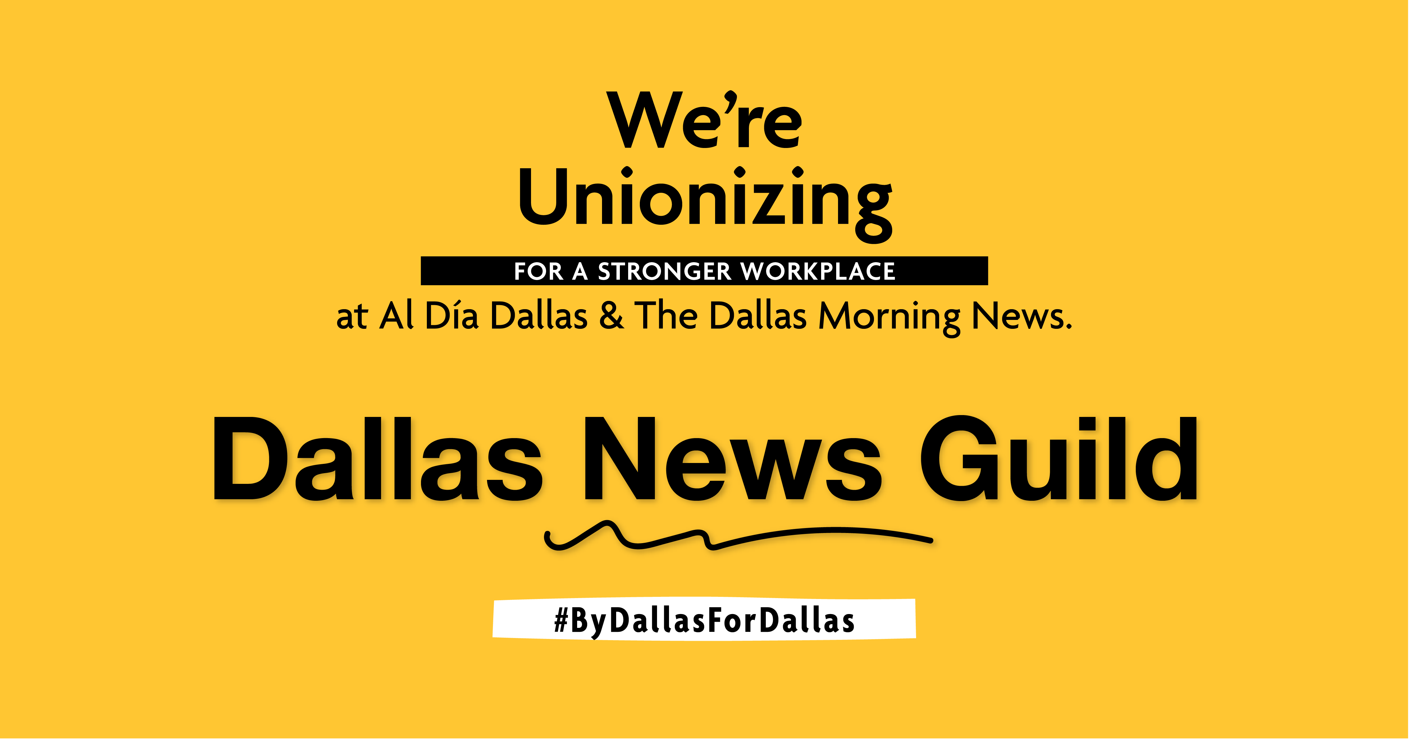 The Dallas News Guild is filing for an election Monday morning and celebrating this next step in our effort to preserve journalism in North Texas. We are turning in our authorization cards to the National Labor Relations Board, triggering the federal election process. We are also turning in 422 letters that our community wrote to Publisher Grant Moise and CEO Robert Decherd. We're asking our colleagues, our alumni and our community to join us for a celebration at Main Street Garden Park as we turn in these letters in person and count our votes. We'll be socially distancing outside while we listen to our colleagues who will be giving speeches about why it's so important to fight for our journalists. Bring a mask and socially distance!