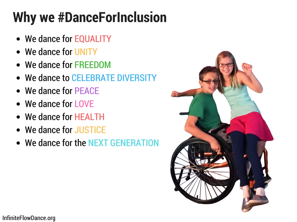 #DanceForInclusion (initiated as #InfiniteInclusion in Nov 2016 and renamed #DanceForInclusion) is a social movement lead by Infinite Flow - A Wheelchair Dance Company to mass market inclusion through dance and innovation, creating infinite opportunities. #DanceForInclusion refers to inclusion in a broad sense. It’s not only a movement advocating for people with disabilities, but also about advocating for other minorities groups (different ethnic & religious groups, LGBTQ, etc), as well as simply including someone at the lunch table or in a conversation at a party. It’s about breaking down barriers everywhere: at work, school, media, entertainment, pop culture, politics, literature, beauty, employment, travel, architecture, transportation, city development, etc.