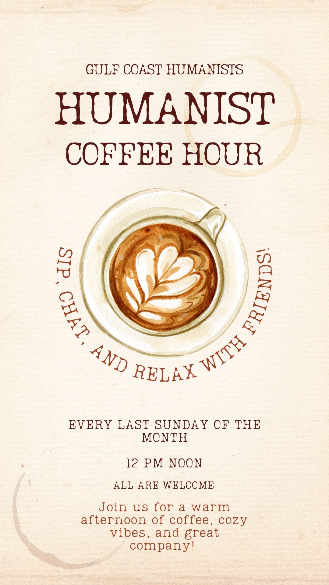 Need a break? Come join Gulf Coast Humanists for a couple of low-key hours. Time to sit back, sip your favorite coffee drink, meet new friends, and talk about whatever's on your mind. We look forward to seeing you!