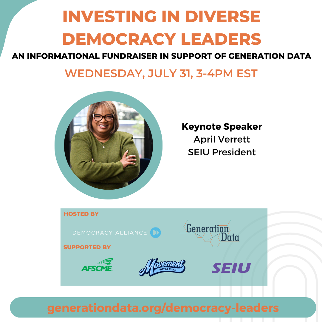 Join Democracy Alliance, Generation Data, and keynote speaker April Verrett, the newly elected President of SEIU, for our Investing in Democracy Leaders virtual fundraiser event on Wednesday, July 31st.