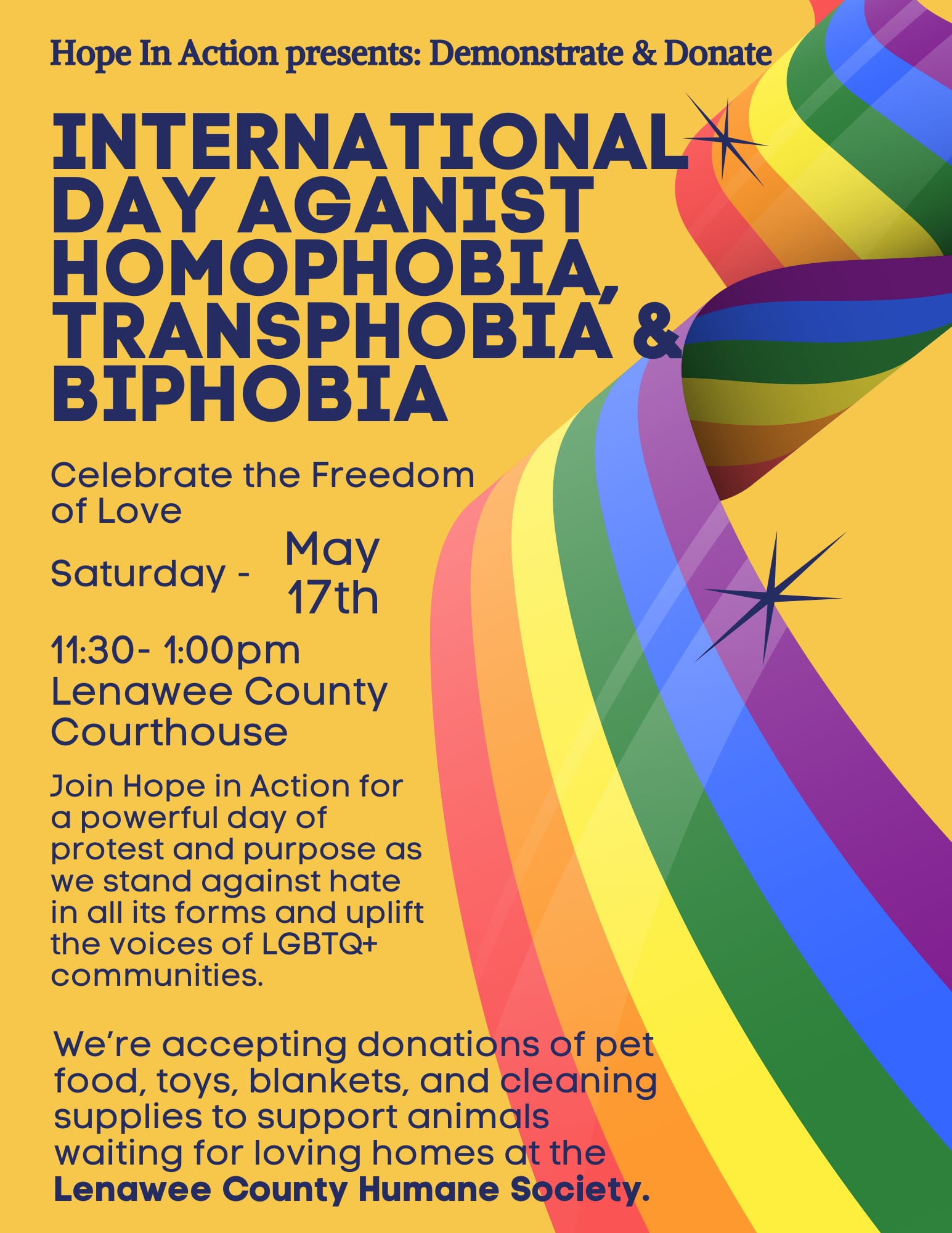 Join a protest on Saturday May 17 to demand TRUMP MUST GO NOW! While celebrating International Day Against Homophobia, Transphobia & Biphobia. We will also be collecting much needed items for the Lenawee Humane Society.