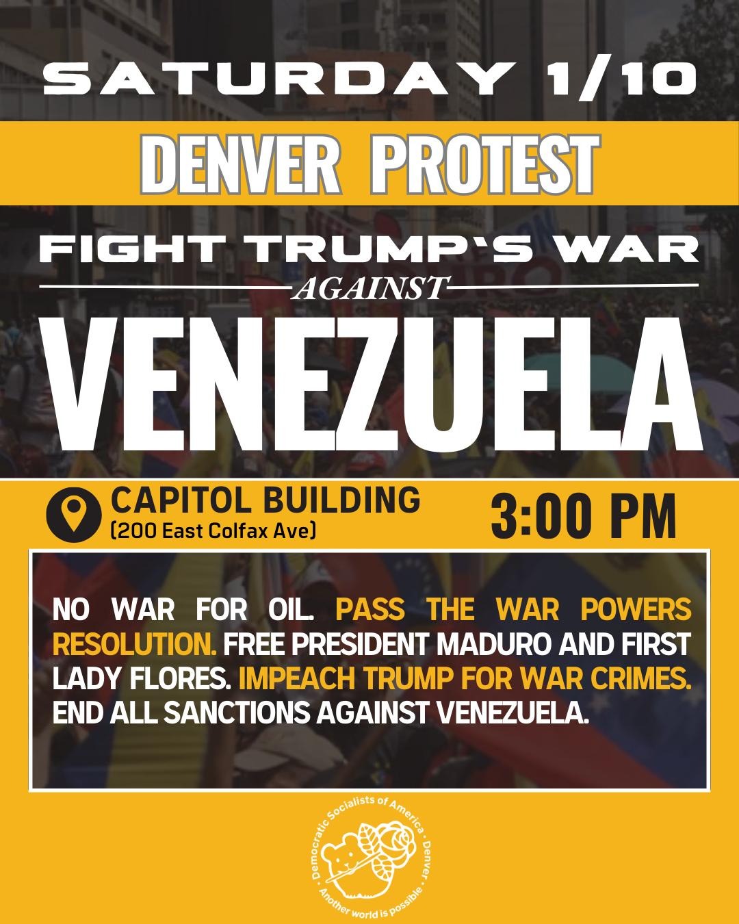 Denver DSA members and our coalition partners are taking to the streets this Saturday, January 10th, to protest this illegal war and stand in solidarity with the sovereign people of Venezuela.