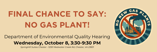 Join us to speak out against Dominion's proposed gas plant in Chesterfield County on Wednesday, October 8! The Virginia Department of Environmental Quality's air permit hearing begins at 5 PM -- but you should arrive by 3:30 PM, if you can, to park, get signed in, and enjoy free food, before entering the hearing with other concerned Virginians. We hope many in the community come to share their voices, and we expect a lengthy, final hearing!