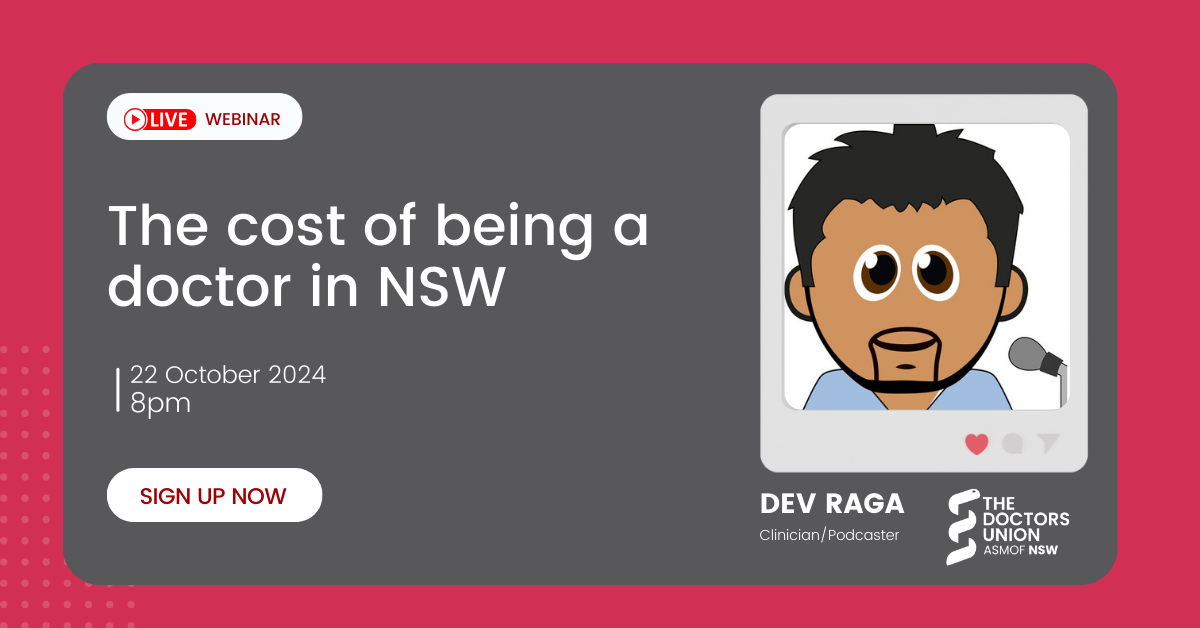 Do doctors in NSW earn a fair wage? In this webinar influential doctor and podcaster Dr Dev Raga will turn his attention to conditions experienced by doctors in NSW public hospitals. How far behind are we? What could improve for doctors if we achieved pay parity with the rest of Australia?