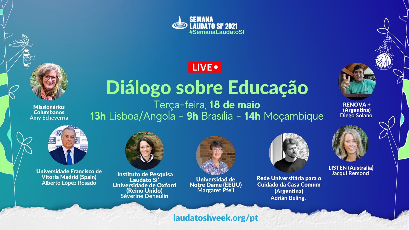 Lideranças de instituições renomadas do mundo inteiro vão compartilhar experiências práticas sobre como usam a Laudato Si’ para inspirar estudantes e vão dar dicas para outras lideranças institucionais para que façam o mesmo em sua parte do mundo.