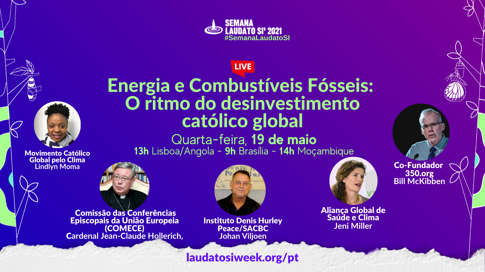 Um diálogo online para conscientizar sobre o papel da energia e dos combustíveis fósseis na crise da nossa casa comum, incluindo impactos na saúde, trazendo atenção para as diretrizes do Vaticano para desinvestimento e o maior compromisso de desinvestimento religioso e católico até hoje. O diálogo incentivará o público a considerar a importância de diretrizes éticas de investimento e fará o convite para que participem da Plataforma de Ação Laudato Si’ para guiar o caminho.