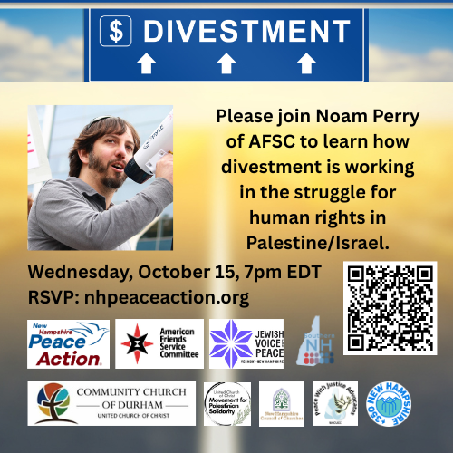 This event is cosponsored by Jewish Voice for Peace VT/NH, American Friends Service Committee/NH, Community Church of Durham, United Church of Christ Movement for Palestine Solidarity, NH Council of Churches, 350 New Hampshire, UCC Peace with Justice Advocates, Southern NH Indivisible,