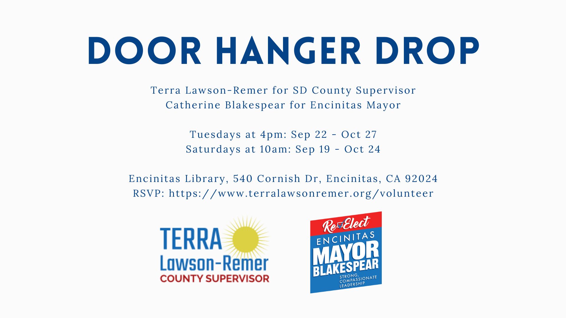 Join us for a Drive-Thru Door Hanger Drop volunteer event! We are working to elect Terra Lawson-Remer as San Diego County Supervisor, and re-elect Catherine Blakespear as Encinitas Mayor. We're committed to (safely) continuing neighbor-to-neighbor voter engagement. We need your help to drop off door hangers to likely voters in Encinitas! Help us spread the word about these amazing candidates.