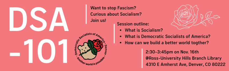 Denver DSA is a chapter of the Democratic Socialists of America, the largest socialist organization in the country. A better world is possible, fight for it with us.