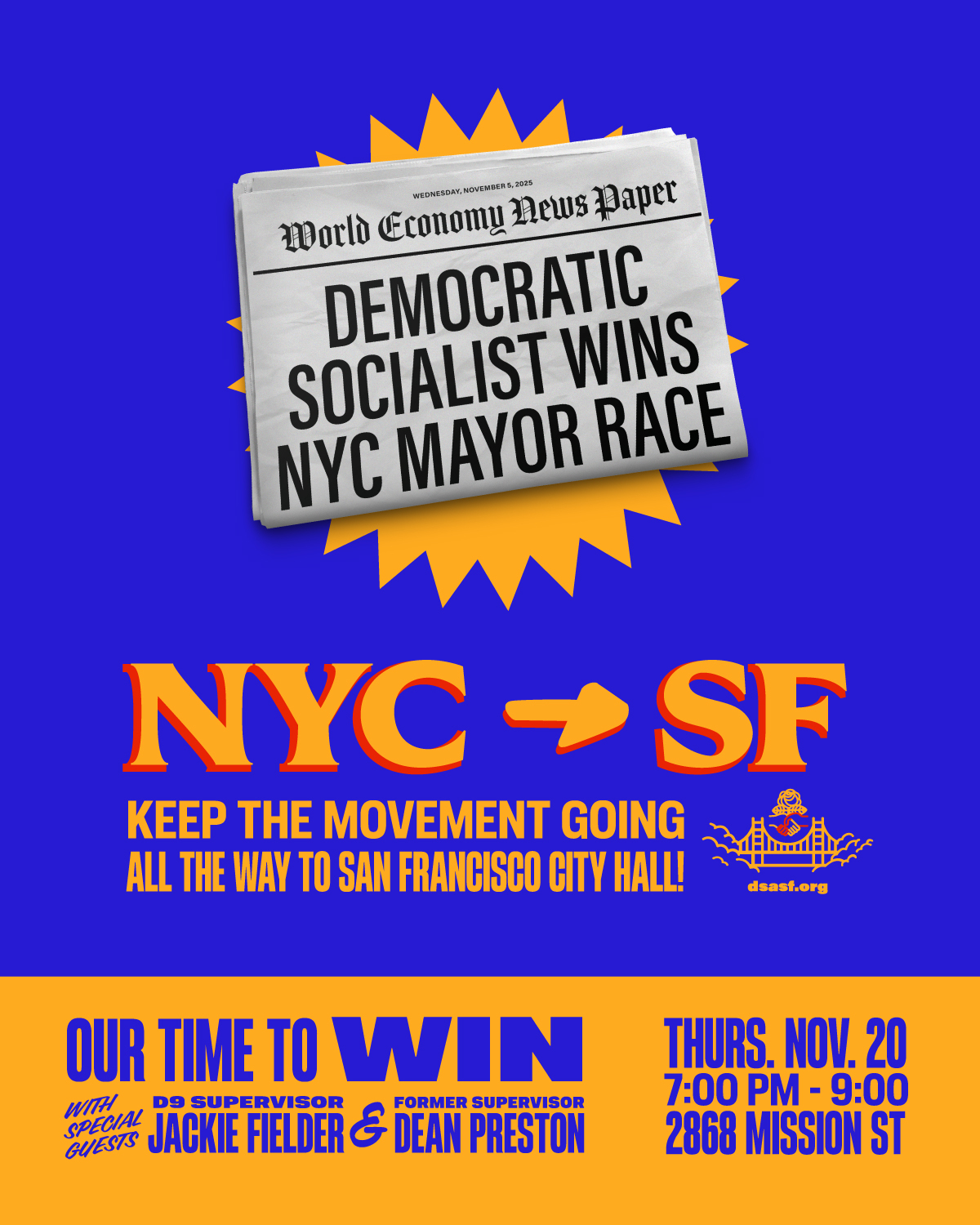 But DSA SF is no stranger to this work. Join us on Thursday, Nov 20 for DSA From NY to SF: Our Time to Win. You’ll get a crash course on how electoral politics work in SF and how socialists can tap in. We’ll be joined by two DSA members: D9 Supervisor Jackie Fielder and former D5 supervisor Dean Preston!