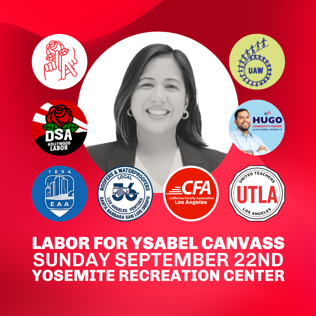 Join DSA-LA, DSA-LA’s Labor Committee, DSA-LA’s Hollywood Labor, UAW Region 6, Roofers & Waterproofers Local 36, EAA, CFA-LA, UTLA, LA City Councilmember Hugo Soto-Martinez, and union members in canvassing for Ysabel Jurado for LA City Council District 14. Ysabel is the labor candidate, and we are ready to knock on doors!