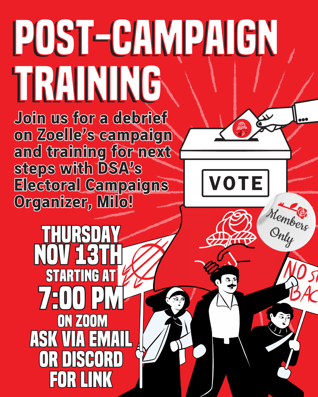 Join us as we break down the results of our campaign for Zoelle with DSA's national electoral campaigns organizer, Milo. Link will be sent to dues-paying DSA members upon RSVP.