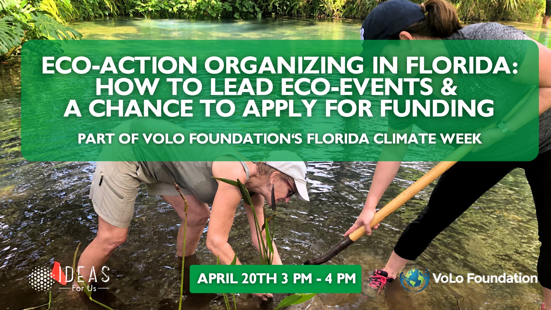 This event is intended to share a full breakdown of eco-action projects can be implemented in Florida at various price points, how to engage in event planning, how to engage in event marketing, recruiting volunteers, and allows attendees a chance to apply for funding through the VoLo Foundation Eco-Action Fund with IDEAS For Us.
