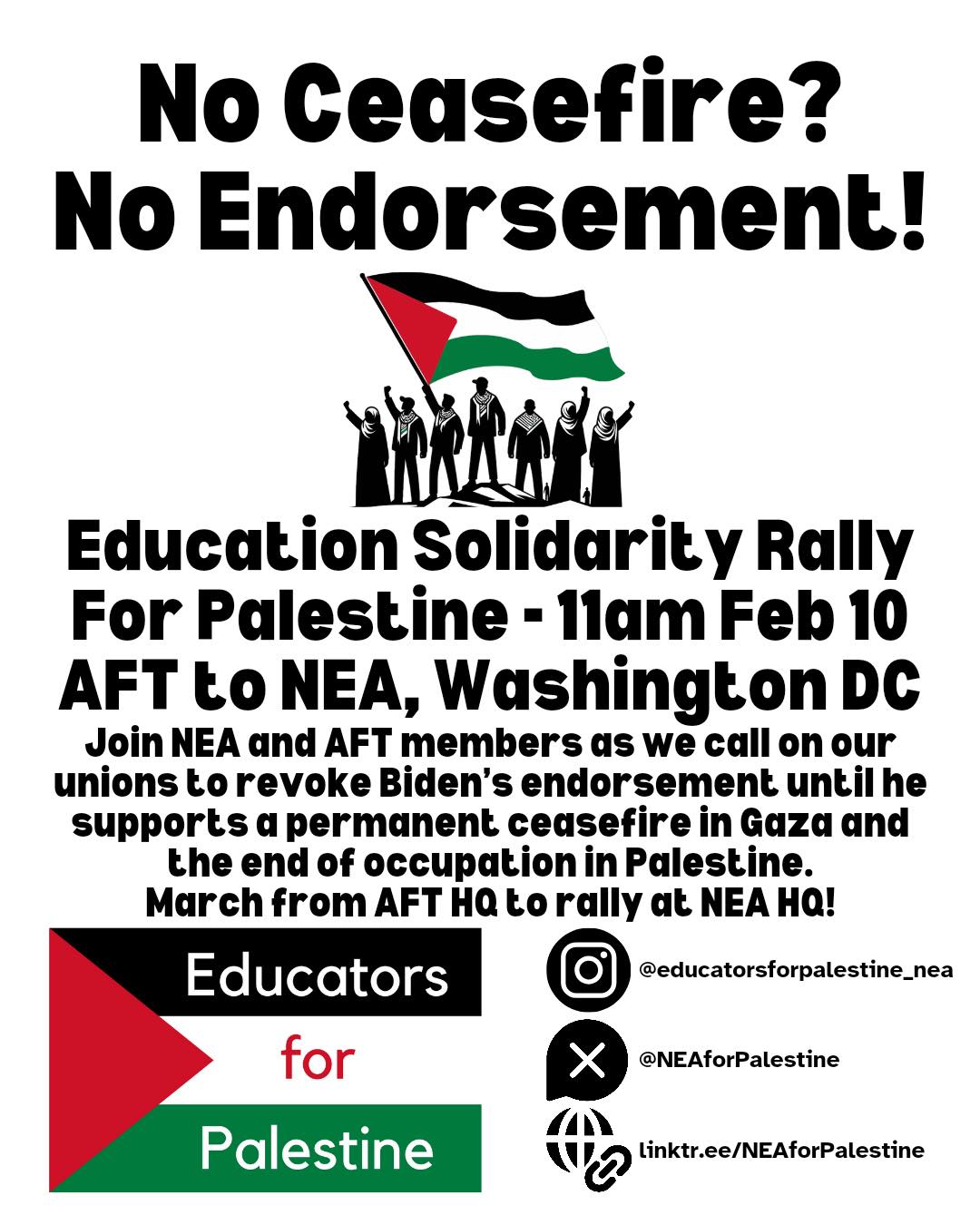 Join NEA and AFT members as we call on our unions to revoke Biden's endorsement until he supports a permanent ceasefire in Gaza ad the end of occupation in Palestine.