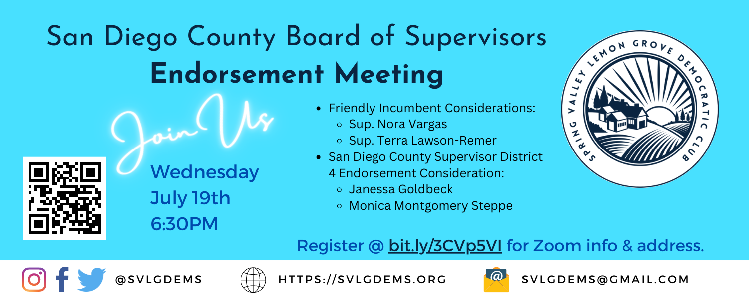 We will be considering an endorsement for the upcoming SPECIAL ELECTION for San Diego County Board of Supervisors, District 4. The following candidates are registered Democrats and will be considered for this endorsement: