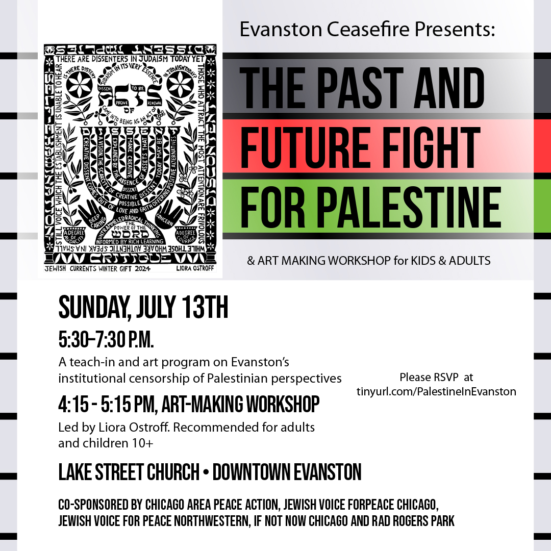 Co-sponsored by Chicago Area Peace Action, If Not Now Chicago, JVP Chicago, JVP NU, Lake Street Church, and Rad Rogers Park.