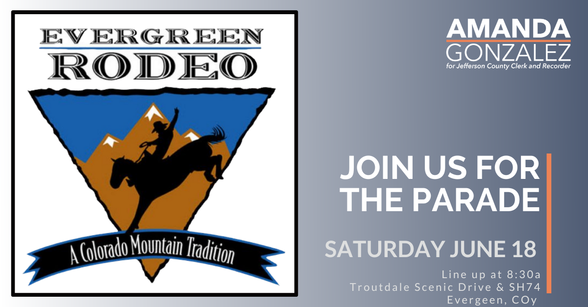 Join Team Amanda and the Jefferson County Democrats as we hand out candy and spread the word about Amanda's campaign for Clerk & Recorder at the Evergreen Rodeo Parade! It'll be a fun morning with thousands of spectators and over a hundred participants, including marching bands, floats, horses, carriages, antique cars and farm equipment, pass by the lake and through downtown Evergreen. We'll meet in the staging area at 8:30 and the parade will
