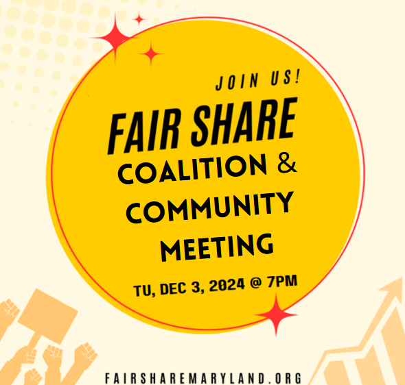 Join the Fair Share Coalition to learn more about our advocacy to reform Maryland’s tax system to close corporate tax loopholes, adequately fund our public services, help our state thrive and be competitive, and deliver tax relief to over 1 million working families.