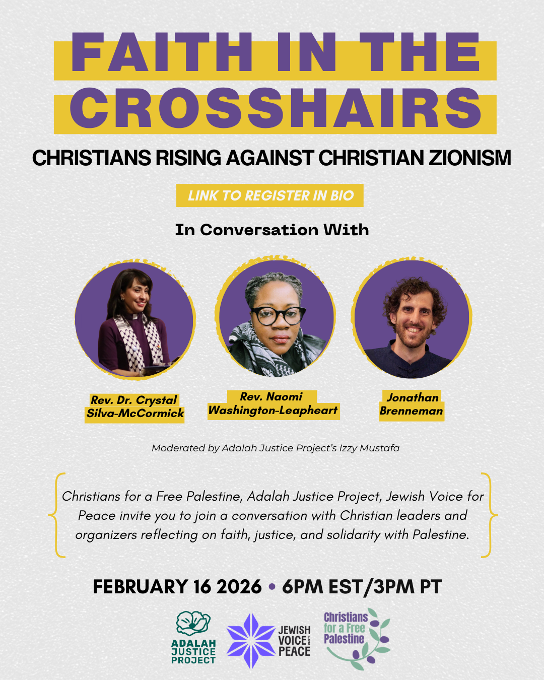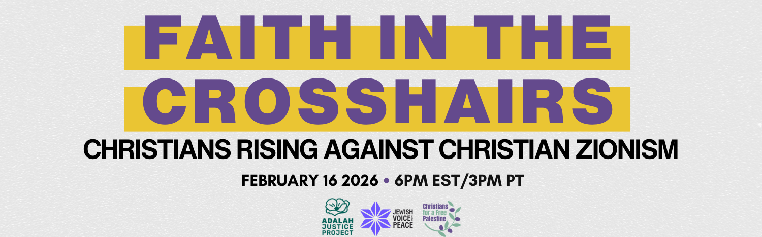 Adalah Justice Project, Jewish Voice for Peace, and Christians for a Free Palestine invite you to join a conversation with Christian leaders and organizers reflecting on faith, justice, and solidarity with Palestine.