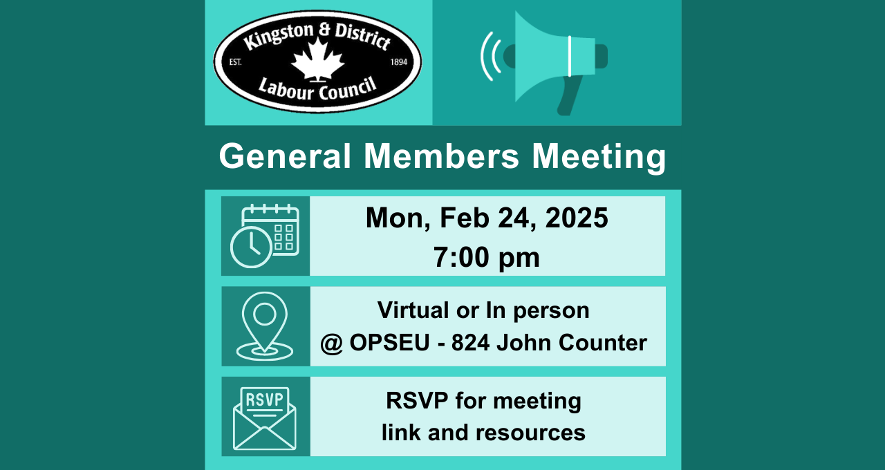 The RSVP is important so that you receive relevant documents and notification of any potential changes or disruptions. Please contact us at kingstonlabourcouncil@gmail.com for any assistance in advance of the meeting date.