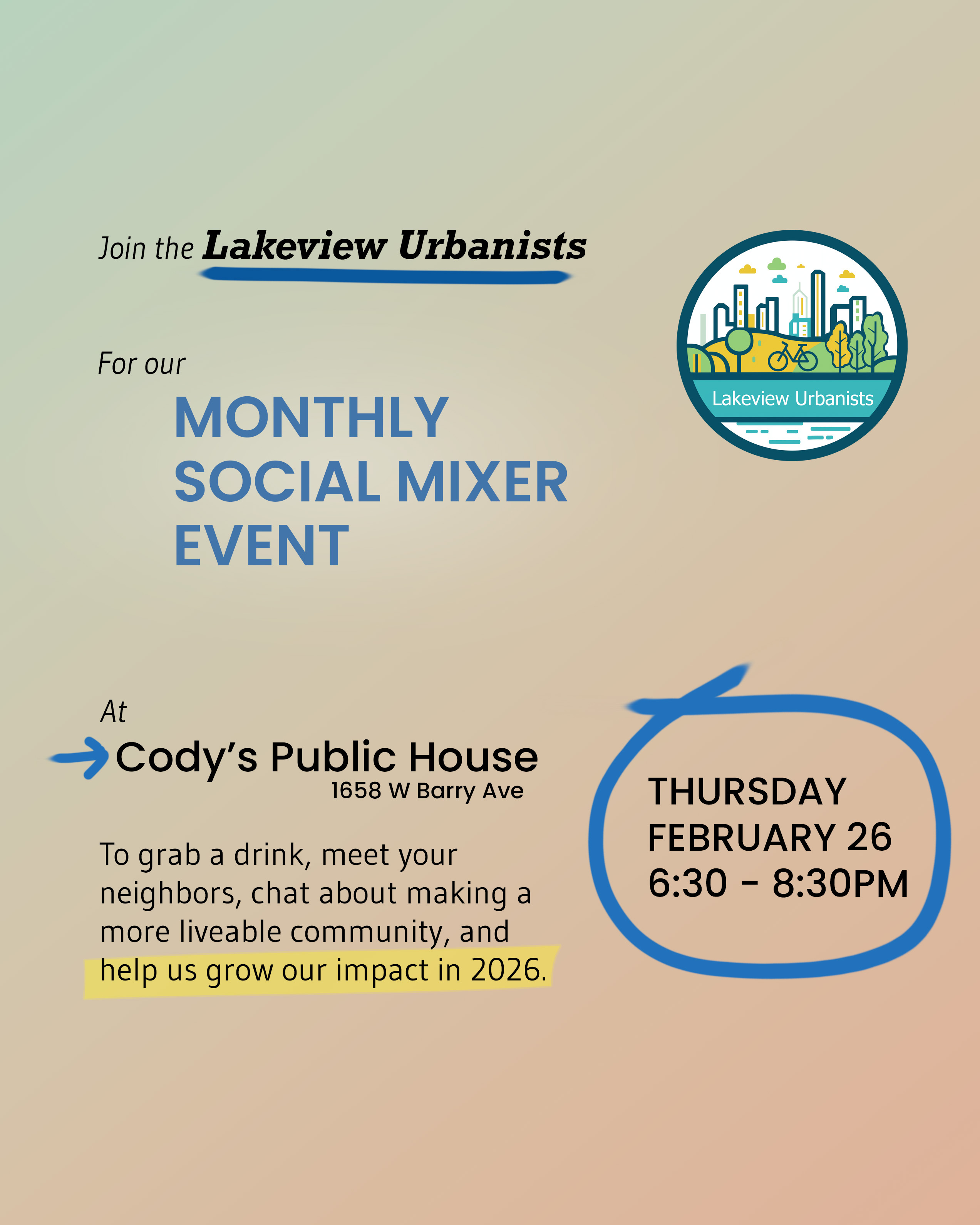 Grab a drink, meet your neighbors, and help us grow our impact in 2026.