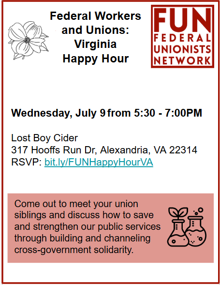 Calling all National Science Foundation workers and other federal employees! Come out to meet your union siblings and discuss how to save and strengthen our public services and support science through building and channeling cross-government solidarity.